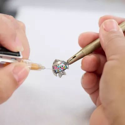 This whimsical fish charm is awash with bright enamel coloring. The intricately detailed sterling silver charm features scales enameled with bright hues. Look closely�there’s even a heart-shaped scale hidden amongst the others to make it extra sweet. The other side of this fish charm is simply detailed silver. This cheerful fish, designed in the Texas Hill Country, looks swimmingly on a charm bracelet with other animal charms. Add to a necklace or anklet to bring a pop of color to your collection. CM-6200-208164 Specifications